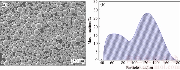 Fig. 3 Micro-morphology (a) and particle size distribution (b) of PREPed TiNi powders