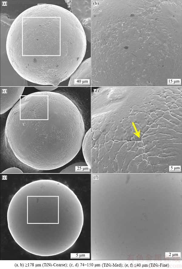 The equiatomic TiNi shape memory alloy was first discovered by BUEHLER et al [1] accidentally. Since its discovery, TiNi alloy has been attracting continuous research interest due to its unique properties such as shape memory effect, good corrosion resistance and good biocompatibility [2]. Recently, additive manufacturing (AM) such as selective laser melting (SLM) process, has been used to fabricate TiNi products for medical implants or actuators [3-8]. In the SLM process, spherical TiNi powders produced by gas atomization were used as the raw feedstock. Since SLM involves very high localized temperature, the characteristics of raw powders play an important role in determining the microstructure and properties of the additively manufactured (AMed) products. For instance, LI et al [8] found that the Ti2Ni secondary phase originally from the raw TiNi powders retained in the AMed sample after SLM; some defects or pores in the AMed sample are also thought to inherit from the raw powders. YABLOKOVA et al [9] also found that particle size, shape, size distribution and surface properties of the feedstock powders affect the powder flowability and processing conditions for SLM. Therefore, a thorough characterization of the starting TiNi powders in terms of microstructure, particle size and shape, and martensitic transformation temperature provides critical information about the technical operation and the attained AMed engineering products.