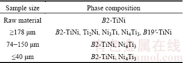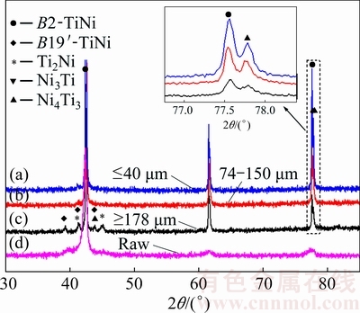 2) Powders with smaller particle size (74-150 μm and ≤40 μm) demonstrate the B2-TiNi and Ti3Ni4 phases, while larger powders above 178 μm show B2-TiNi as the main phase plus minor Ni3Ti and Ti2Ni secondary phases most possibly owing to the eutectoid decomposition of TiNi → Ni3Ti + Ti2Ni at 630 °C during cooling.