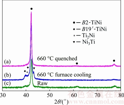 To further confirm our speculation and investigate the effect of cooling rate on the phase transformation during cooling, bulk TiNi samples cut from the raw rod were subjected to a water-quenching and a furnace- cooling heat treatment, respectively. As illustrated in the experimental section, one batch of disk samples was first heated to 660 °C (well above 630 °C) and held for 0.5 h in a vacuum furnace, followed by water quenching. The other batch was subjected to the same heating treatment but followed by furnace cooling. Figure 8 shows the XRD patterns of bulk samples after the two heat treatments. Only the B2-TiNi phase is observed in the water-quenched sample (Figs. 8(a) and (c)). On the contrary, as shown in Fig. 8(b), the phases observed after furnace cooling from 660 °C include B2-TiNi, Ni3Ti and Ti2Ni. This suggests that different cooling rates result in diverse phases or phase transformations, although both experiments used the identical raw material. Again, this further proves that the eutectoid reaction of TiNi → Ni3Ti + Ti2Ni at 630 °C (Fig. 7) is inhibited by water quenching due to very high cooling rate, while this reaction is inevitable during furnace cooling. Therefore, this result agrees well with the previous analysis, confirming the effect of cooling rate on the eutectoid reaction at 630 °C, leading to different phase constituents. This further indicates that the existence of Ni3Ti and Ti2Ni secondary phases in large powders is most possibly owing to the eutectoid decomposition of TiNi → Ni3Ti + Ti2Ni at 630 °C during cooling. BASAK et al [14] also observed nano-sized Ti2Ni particles co-existing with predominant B2-TiNi phase in the macro-sized PREPed Ni-Ti-Fe powders. They also speculated that the existence of Ti2Ni is a result of an equilibrium eutectic reaction owing to its low cooling rate. It needs to note that the mean particle size of the PREPed Ni-Ti-Fe macro-powders in Ref. [14] was much larger, i.e., 400 μm, than that of powders in this study. Nevertheless, the eutectoid reaction of TiNi→ Ni3Ti+Ti2Ni at 630 °C should be more likely to occur during rapid cooling in larger particles.