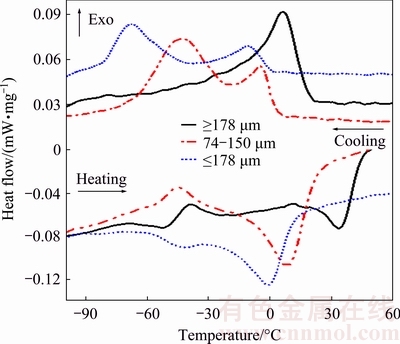 In addition, the existence of secondary phases, i.e., Ni3Ti and Ti2Ni (Fig. 6(c)) in large powders may favor the one-step B2→B19′ martensitic transformation, as shown in Fig. 9. It is interesting to note that the reverse martensitic transformation is only one-step B19′→B2 transformation for all the TiNi powders (Fig. 9), indicating that reverse R phase transformation and reverse martensitic transformation are overlapped [30,31]. This phenomenon has been analyzed systematically by REN et al [27,32,33].