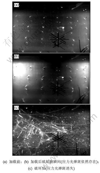 由图1可以看出:即使承受载荷不断变大,2块玻璃的变形均一样,真空玻璃仍保持为一体,说明在外载作用下真空玻璃的2块基片在该处的变形是协调的。另外,由于真空玻璃在大气压作用下,会在支撑物与玻璃表面接触部位产生应力集中,因此,可以借助光弹仪,观察其从受载直至破坏整个过程中各支撑点处的应力光斑变化,了解真空玻璃任何一个支撑点处的应力变化与变形协调。图2(a)所示为真空玻璃受载前的应力光斑图;图2(b)所示为真空玻璃受载破坏前一瞬间的应力光斑图;图2(c)所示为破坏后的应力光斑图。从图2可以看出:即使在破坏前一瞬间,真空玻璃的支撑应力光斑图仍与受载前相同,即2片玻璃仍与支撑物相互紧密接触(如变形不协调,则该处应力光斑将消失),说明真空玻璃在外载作用下2块基片变形十分协调。这是由于真空玻璃中间层是真空层,巨大的大气压差使2块基片与中间的支撑物接触在一起,而真空玻璃受外载作用一般远小于大气压对真空玻璃的作用,因此,2块基片不会因外载作用而导致变形不协调。