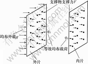 真空玻璃的2块基片的四周被低熔点玻璃固定在一起。支撑物只起支撑作用,对接触面不产生面内剪应力和弯矩,因此,在均布载荷作用下,2块基片均按各自的中性层弯曲,中性层在玻璃横截面对称轴上。在外载作用下,直接承受载荷的一块基片将部分载荷由支撑物传递到另一块基片上,此时,2块基片共同分担着外载作用。由于真空玻璃支撑物均匀密集地布置在玻璃板面积内每个部分,每个支撑物受力F基本相同,为简化计算,可将作用于玻璃板分散的支撑力视为均布压力(见图3)。设外片玻璃受均布载荷q作用,内外片受支撑物作用的等效均布载荷为q0,则外片玻璃在q-q0作用下弯曲,内片玻璃在q0作用下弯曲,由试验结果可知,各支撑点处内外片玻璃挠度变形协调,即
