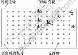 试验选用的真空玻璃均为北京新立基真空玻璃技术有限公司生产,真空玻璃的长、宽分别为0.51 m和0.36 m,2块基片厚度均为4 mm。真空玻璃承受的均布载荷采用负压方式加载,通过真空泵抽气调节负压,以便对真空玻璃施加不同的均布载荷。预先在真空玻璃内外基片(直接承力面为外片)的外表面不同部位粘贴应变片,以记录玻璃板在均布载荷下的应力分布特征。采用基恩士公司生产的LK-G40激光位移传感器,测量真空玻璃2块基片在均布载荷作用下的变形。该传感器通过入射激光穿过第1块玻璃照射到第2块玻璃表面上,并接收2块玻璃表面反射回来的光线,从而可以同时精确测量到2块玻璃的变形。另外,通过在光弹仪上连接CCD(Charge-coupled device)摄像头,记录从加载到真空玻璃破坏过程中支撑点处的应力光弹斑图,观察受载过程中其内部结构的变形及应力分布变化趋势。