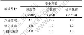 (3) 真空玻璃强度综合安全系数及强度设计值。根据表3和表4,可以得到玻璃的综合安全系数。按真空玻璃基片玻璃品种,将真空玻璃基片的平均弯曲强度除以综合安全系数,即得真空玻璃的强度设计值,见表5,其中玻璃的弯曲强度为建筑玻璃应用技术规程(JGJ 113—2003)所规定。
