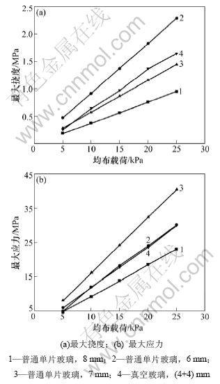 由于真空玻璃结构复杂,无法采用理论计算得出真空玻璃的等效厚度。通过试验,获得在载荷作用下真空玻璃和相同面积普通玻璃的最大弯曲挠度和应力分布状况,见图7。由图7可以看出:与同样厚度的普通玻璃相比(例如4 mm+4 mm的真空玻璃与8 mm的普通玻璃相比),在相同载荷下,真空玻璃的最大挠度和应力均比普通玻璃的大。即真空玻璃的承载能力比同等厚度的普通玻璃的小,总厚度为8 mm的真空玻璃与7 mm的普通玻璃承载能力相当。所以,对真空玻璃进行抗风压设计时,总厚度而应采用一个折算厚度(等效厚度)。