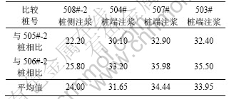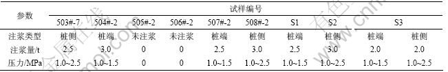 注浆桩的具体情况为:503~508号桩基加3根试验桩S1,S2和S3。其中,505号和506号桩为未注浆桩,S3为桩端桩侧同时注浆,其余为注浆桩。桩侧注浆点的位置为桩长的2/3处,桩端和桩侧注浆均用预埋管。各试验桩注浆参数如表1所示。