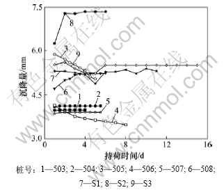 从图2可以看出:在6.0 MN恒定荷载作用下(远大于工作荷载4.6 MN),随着持荷时间的延长,总体沉降趋势不变。在持荷荷载为4.6 MN时,随着持荷时间的延长,其沉降有微量回弹趋势。因此,后注浆技术是减小桩基工后沉降的有效方法之一。