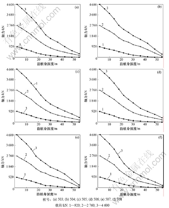 (4) 加载初期,由于桩侧阻力较小,曲线较陡,随荷载增加,曲线逐步变缓,说明桩侧阻力在逐渐发挥,桩端阻力也随之不断增大,也说明各测试截面轴力随加载的增加逐渐增加,而增幅则与桩侧各土层阻力的发挥程度有关。