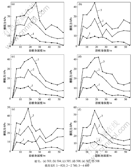 (1) 503~508号桩桩侧阻力的最大值分别出现在桩顶以下位置:26,18,20,20,18和20 m;对应的最大摩阻力分别为:44.60,44.60,42.20,41.40,48.56和55.73 kPa。而最大摩阻力对应的土层为粉质土,其对桩基的摩阻力发挥比黏土、淤泥质黏土和粉质黏土的好。