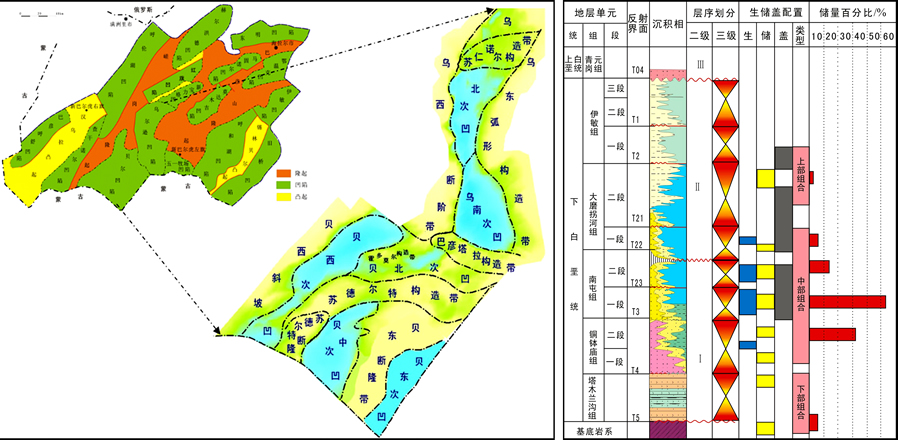 陷是海拉尔盆地油气勘探的主区域,其剩余资源潜力较大。根据岩性-地层油藏成藏特征及分布规律,对有利勘探区带进行预测。研究结果表明:乌尔逊—贝尔凹陷发育3套主力烃源岩、6种沉积体系,发育4类储层及多个高孔隙带,经历5期构造运动,形成6次沉积间断,在垂向上形成3套生储盖组合,为岩性-地层油藏的形成提供有利的地质条件。 按照圈闭成因及其几何形态,将其发育的岩性-地层油藏划分为岩性油藏、地层油藏和复合油藏3种类型油藏。油气主要沿不整合面及不同级次湖泛面上下分布,平面上围绕生油洼槽分布,不同的构造带上岩性-地层油藏类型特征不同。经钻探新发现3个整装规模储量的岩性-地层油藏,勘探效益显著。