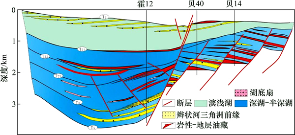 1) 在断控陡坡带的断层下降盘,沉积了较厚的低位域砂体,且储层物性良好,而发育在低位域砂体之上的湖侵域和高位域早期优质烃源岩既是其直接的油源岩,也是低位域砂体的盖层,构成了良好的生储盖组合。断控断层的生长指数大,并易形成断面泥质涂抹层,造成侧向封堵,形成有利的断层封闭,因此,在断控陡坡带附近容易形成断层-岩性和岩性油藏,可多点成藏富油。单个油藏油柱高度不大,油水系统多,油水分异不彻底,但油藏复合体范围内总的油层厚度较大,如贝西斜坡油藏(图7)。