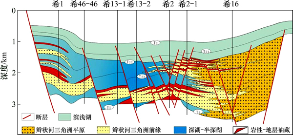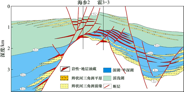 4) 在缓坡断阶带上,受同沉积断裂的控制,辫状河三角洲或扇三角洲砂体发育,储层物性良好,且由于缓坡带是低势区(相对于生油凹陷中心来说),紧邻生油中心,是油气运移的指向区,发育的低位域砂体与湖侵域和高位域早期的厚层泥岩组合,容易形成断层-岩性和岩性油藏,油层分布较稳定,厚度大,产能高,油藏规模大,如乌东斜坡油藏(图10)。