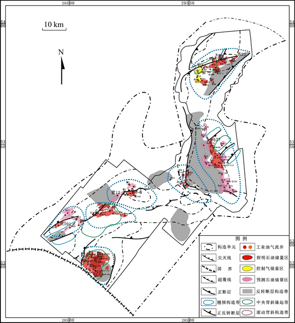3) 洼槽区的中央构造带,左右逢源,是油气运移的指向。加之构造带上的断块、断鼻等圈闭与洼槽区烃源岩形成良好的运聚组合关系,因此,洼槽区内发育的断裂构造带易于形成以岩性或构造-岩性等复合油藏为主的油气聚集区带,如霍多莫尔构造带油藏等 (图9)。