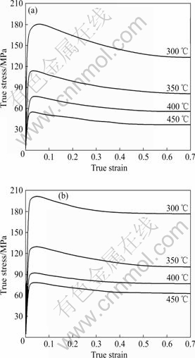 Fig.1 True stress—true strain curves at different strain rates: (a) 0.01 s?1; (b) 0.1 s?1