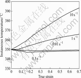 =10 s?1)。从图2中可以看出,在350 ℃变形时,随着应变速率增大,试样温度变化越来越明显,其中应变速率为10 s?1时,试样温度几乎随应变线性上升,真应变为0.7时,试样温度达到393 ℃,比预设温度350 ℃高出43 ℃。而当应变速率为0.01 s-1时,温度的变化可由热模拟机的加热系统予以补偿,试样温度在整个变形过程中基本上维持在350 ℃左右。