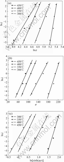 图3和4所示分别为在热压缩过程中峰值应力与应变速率和变形温度的关系。由图3和4中所示直线的斜率可以得出n1=11.795,β=0.142,进而计算出α=β/n1=0.012 mm2/N,变形激活能Q=370.8 kJ/mol,应力指数
