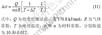 ≥10 s?1)变形过程,其测量值是不真实的。此时温升只能通过理论计算得出,并近似认为高应变速率下变形为绝热状态。本研究引入以下方程[9]计算应变速率为10 s-1时由变形热所引起的试样温升: