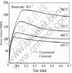 图6所示为应变速率为10 s?1条件下修正的应力—应变曲线与未修正的应力—应变曲线的对比。从图6中可以看出,修正前后应力—应变曲线的走向基本一致,且在低应变下,两曲线基本重合,但到达峰值应力后,修正曲线就明显高于未修正曲线。在应变速率为10 s?1的条件下,当温度为300 ℃且应变达到0.7时,修正与未修正应力值相差最大,为20.4 MPa。而且,随着变形温度的升高,变形热减少,这种差值也逐渐减小。另外,从图6中还可以看出,即使引入了变形热的修正,修正后的流变曲线仍然表现出流变软化的特征,这可能是因为发生了动态再结晶的缘故。