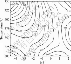 3) 高温低应变速率变形区域,即变形温度为450 ℃、应变速率为0.01 s?1的区域,功率耗散系数最大,约为0.39,可能发生了动态再结晶等组织转变。