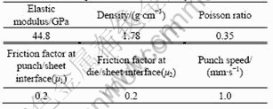 Fig.1 shows the FE model. There were four cavities contained in the punch, and the shape of the cavities was cone. The diameter at the bottom, the diameter at the top and the height of the cavities were 3.5 mm, 2.5 mm, and 5.0 mm, respectively. Due to the symmetry of the part, 1/4 blank was used in the FE simulations. The present analyses adopt the following assumptions: 1) both of the punch and die were rigid bodies, and the blank was a visco-plastic material; 2) frictions at tool/sheet interface were simulated by friction shear model with a constant friction factor; 3) the forming process was isothermal and the temperatures of the tool and the sheet were 300 ℃. The stress—strain relationship of AZ31 magnesium alloy from hot compression test was used in the FE simulation[15]. Other parameters used in the FE simulation are listed in Table 1.