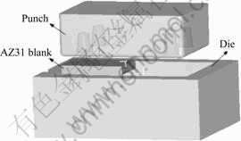 Press forging experiments were carried out to verify the results of FEM simulation results. Fig.2 shows the tools for press forging. The AZ31 sheets were cut by linear cutting machine into rectangle blanks with 20 mm in width, 30 mm in length and 2.0 mm in thickness. The clearance between the punch and die was 0.8 mm, i.e. sidewall thickness of the press forged part was 0.8 mm. The temperatures of the punch and the die were heated to 300-350 ℃ by cartridge heaters, and then the blank at room temperature was sandwiched between the high