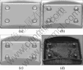 Fig.3 shows the experimental results and the forming process when the punch stroke reaches 0.6 mm, 0.9 mm and 1.2 mm. It is clearly seen that four bosses and sidewall are formed synchronously, the maximal sidewall height is located in the middle part of the long sides of the rectangular box and the height of the corner is minimal. Fig.3(b) also indicates that the top of the bosses is formed unevenly, and the regions of the cavities far away from the center are filled earlier than those close to the center. Fig.4 shows the variation of average height of boss (average value of maximal and minimal height of the boss) during press forging obtained