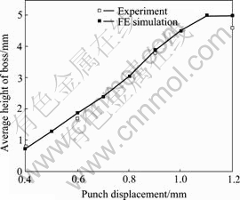 from FE simulation and experiments. It is clearly seen that FE results accord well with the experimental results before the punch stroke reaches 0.9 mm, but the final boss height in the experiment is 4.6 mm, which is less than that predicted from the FE simulation (5 mm). The reason is that there is no vent in the punch cavity and the punch cavity is airtight during press forging, so the metal cannot fill the cavity completely.