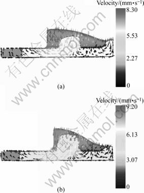 Fig.5 Effect of friction factor on velocity field at punch stroke of 0.6 mm: (a) μ1=0.2, μ2=0.2; (b) μ1=0.2, μ2=0.7