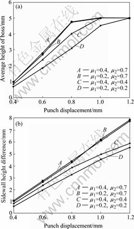 of boss formation, and curves A and B, B and D show that die/sheet interface has much significant effect on improving boss forming efficiency. Fig.6(b) indicates that the height difference of the sidewall increases with the increase of the friction factor and that the die/sheet interface also shows more important influence on sidewall height difference.