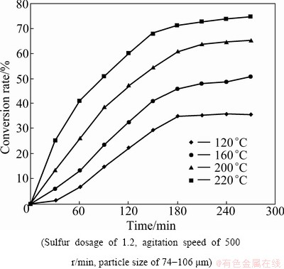 Figure 3 shows effect of temperature on hydrothermal sulfidation of synthetic hemimorphite at 120–220 °C. The results indicate that the temperature has a pronounced effect on the conversion of hemimorphite. The hemimorphite conversion rate increases greatly with the temperature increasing in the range and about 71% hemimorphite was sulfidized at 220 °C in 180 min.