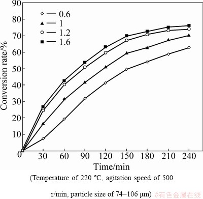 Fig. 5 Effect of particle size on conversion rate of hemimorphite