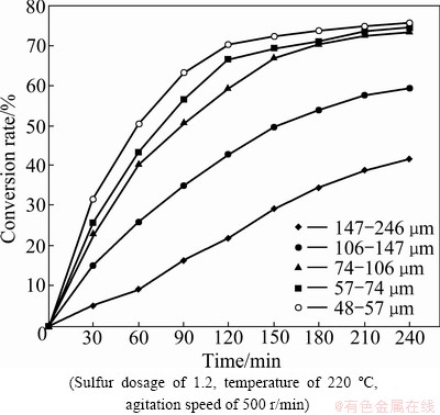 The influence of particle size on synthetic hemimorphite conversion was studied using different particle sizes, 147-246, 106-147, 74-106, 57-74 and 48-57 μm, and the results are shown in Fig. 5.
