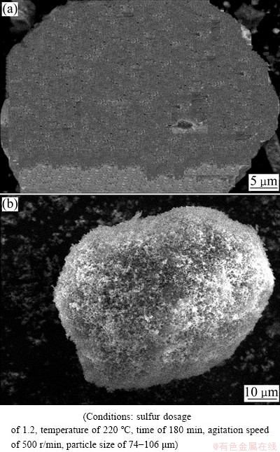 The morphology of the hemimorphite particles before and after hydrothermal sulfidation was examined by SEM. The solid particles present a rough and porous surface, as observed in Fig. 6(a). The micrograph of the sulfidized product indicates a progressive increase in the roughness and porosity of the solid. Figure 6 also shows that the particle surface presents a reaction product layer with the progress of hydrothermal sulfidation. And the mineral surface is covered completely by porous product. Therefore, the hemimorphite sulfidation process is controlled both by interfacial transfer and diffusion of the reagent in the porous structure of the solid particles.
