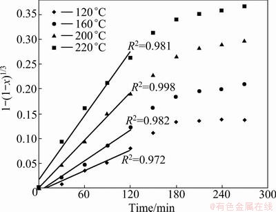 Fig. 7 Plot of 1-(1-x)1/3 against time at different temperatures