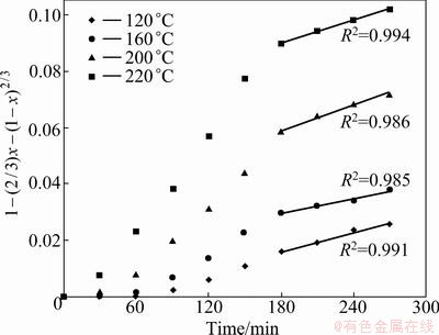 Fig. 9 Plot of 1-(2/3)x-(1-x)2/3 versus time at different temperatures