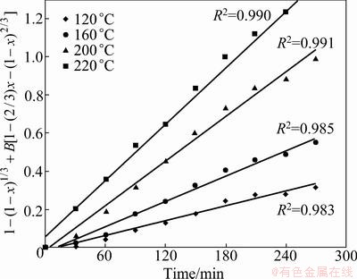 Fig. 11 Plots of 1-(1-x)1/3+B[1-(2/3)x -(1-x)2/3] vs time at different temperatures