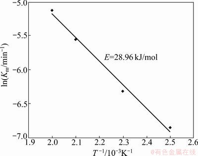 The Arrhenius plot constructed with the rate constant value Km calculated from the data presented in Fig. 11 is shown in Fig. 12. The activation energy of the overall reaction given from Fig. 12g is 28.96 kJ/mol.