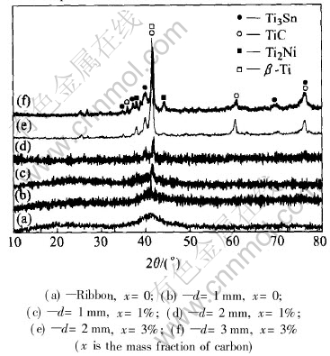 The X-ray diffraction was used to analyze the phase constitutes of the melt-spun ribbons as well as the as-cast composite rods. The typical XRD patterns are shown in Fig.1. It is shown that the XRD patterns of the melt-spun ribbons display no distinct crystalline diffraction peak, indicating the formation of an amorphous phase. For alloy rods with diameter equal to or larger than 1mm, the diffraction peak of crystalline phase can be found from the XRD patterns, which also implies the severe conditions required to fabricate monolithic Ti-based BMG. For d1mm rods, a small crystalline diffraction peak that was identified to be β-Ti was found imposed on the broad diffraction peak. The intensity of the crystalline diffraction peak increases with the increasing carbon additions. For alloy rods with diameter larger than 1mm, which corresponds to slower cooling rate, the diffraction peaks of Ti3Sn and Ti2Ni phase were also found from the XRD patterns. For the alloy rods with the same diameter, the increasing carbon addition to the Ti50Cu23Ni20Sn7 BMG forming alloys not only contributes to the diffraction peaks of TiC, but also leads to the increasing intensity of the Ti3Sn diffraction peaks.