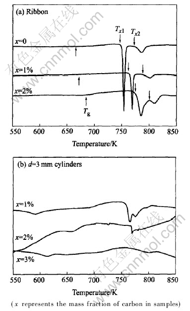 DSC analyses carried out for the melt-spun ribbons and as-cast rods are shown in Fig.2. For melt-spun ribbons, all the samples exhibit two obvious exothermic peaks. With increasing carbon addition, the glass transition temperature Tg of the alloy, as well as the first and second crystallization peak Tx1 and Tx2 move to a higher temperature. While the temperature range of the supercooled liquid region doesnt seem to change a lot. However, the temperature interval between the first and second crystallization temperature decreases obviously by adding carbon elements. For the d3mm rods, the exothermic peaks are very weak and the variation of the glass transition temperature and the crystallization temperature with the carbon addition is similar to that of melt-spun ribbon, but the absolute value is quite small, indicating the major part of the samples being crystalline. For d3mm rods with 3% carbon addition, no glass transition and crystallization peak can be found. By comparing the exothermic heat flow released during crystallization of the as-cast rods with that of the melt-spun ribbons, the volume fraction of glass phase in the as-cast rods can be estimated as about 20% for the d3mm carbon-free alloy rods and about 10% for the d3mm cylinder containing 1% carbon addition.