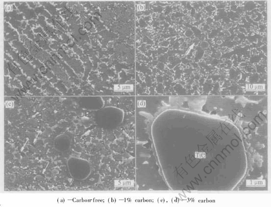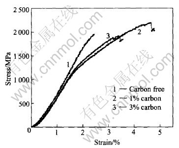 A series of compression tests have been carried out for the d3mm as-cast Ti-base alloy rods at room temperature. Fig.4 shows the typical stress—strain curves. For the carbon-free alloy rods, the ultimate compression stress reaches 1936MPa with nearly zero plastic strain for the sample. For the rods with 1% carbon addition, yielding occurs at about 1160MPa, followed by “work hardening” stage. The ultimate compression stress is 2195MPa and the plastic strain reaches about 3.1%. With 3% carbon addition, there is a similar yielding and “work hardening” behavior like that of rods with 1% carbon addition. However, the ultimate compression stress is less, with the value of about 1913MPa. And the plastic strain of about 1.3% is obtained before failure.