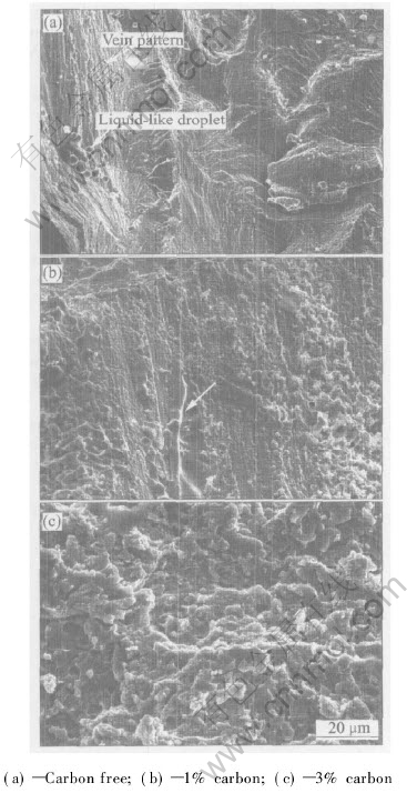 For the d3mm as-cast rods with various carbon additions, the fracture occurs roughly along the maximum stress plane during compression, but none of the fracture plane is along about 45° with the loading direction. The SEM images of the fracture feature observation of d3mm samples are shown in Fig.5, which exhibit more complex fractured surfaces compared to monolithic BMGs. For carbon-free Ti50Cu23Ni20Sn7 rod, the fractured surface is composed of several fractured planes, as shown in Fig.5(a). Although there are glass phase and crystalline phase, there is no obvious evidence of interaction between the shear bands and the crystalline and no plastic deformation appears in the materials. The Ti2Ni particles are reported to be a brittle phase and can significantly reduce the ductility of the as-cast samples. Vein pattern are found along the shear-off direction of the fracture. The liquid-like droplets are observed in some regions of the fracture surface, indicating the high elastic deformation behavior of the glass phase of the material. The very fast concentration of the elastic energy in the shear bands leads to temperature rise to about several tens Kelvin in a very short time and causes the amorphous matrix to be remelted. For as-cast alloy rods with 1% carbon addition, the fractured surface is shown in Fig.5(b). Vein pattern cannot be clearly found on the fractured plane due to the little volume fraction of glass phase. However, some liquid-like region can be observed, as shown by an arrow in Fig.5(b). In the area near the liquid-like region, many protuberances can be found on the fractured surface. The existence of the protuberances is believed to contribute to the large plasticity of the material, which is formed by the squeezing between the glass phase and the ductile β-Ti phase during the deformation process. From the microstructure observa-tion shown in Fig.3(b), it can be found that the