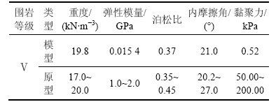 本次试验根据模型大小与相似关系,经过多次配比试验,确定河砂、重晶石粉、凡士林的混合物作为相似材料的原料,其配比为5.4:10:1(质量比)。本次模拟的原型材料的围岩级别为V级,围岩原型与模型的物理力学参数如表1所示。