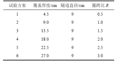 浅埋隧道的破坏与围岩地质、隧道埋深、隧道跨度、地应力、地下水等有关,本文主要研究隧道覆跨比(R,隧道的埋深H与跨度D之比)对隧道破坏模式的影响。此次试验主要研究R=H/D=0.5,1.0,1.5,2.0,2.5和3.0 (H为隧道拱顶到地表的距离,D为隧道的直径)条件下隧道的不同破坏模式,试验方案如表2所示。
