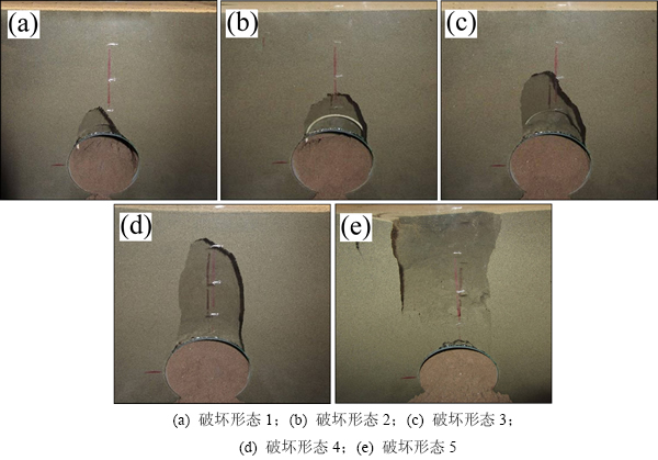 试验过程中,将模型材料分层填入模型箱,当材料填入高度为100 mm时,将外径为90 mm、长1 m的PVC管放入预留孔洞中,严格控制模型材料的密度,继续填入模型材料直至试验方案控制的覆盖厚度。试验时通过缓慢匀速抽出PVC管模拟隧道的全断面1次开挖,为减小模拟开挖对围岩的扰动,在PVC管外壁涂抹润滑油。试验开始前,安装定位好照相机、摄像机,以求得到清晰、有效的试验结果图片。模型全部制作完成后静置8 h开始试验,模拟开挖后自重应力场作用下毛洞状态时隧道围岩的破坏过程。