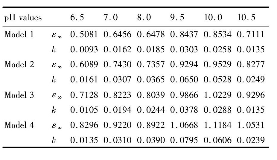 由表3可知,4个动力学模型的浮选速率常数k在p H值为6. 5 ~ 9. 5之间逐渐增大,均在p H值约9. 5左右达到最大值,而p H > 10以后浮选速率常数k明显减小。