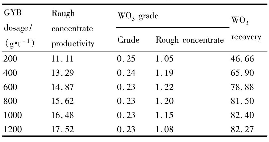 由表8可看出,GYB用量在1000 g·L- 1以前粗精矿回收率呈递增趋势,而达1200 g·L- 1后回收率反而下降。GYB用量为1000 g·L- 1指标最佳,为合适用量。