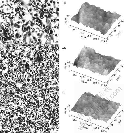 Fig.1 Surface CLSM images and corresponding three-dimensional images of ceramic coatings formed at different current densities: (a), (b) 3 A/dm2; (c), (d) 4 A/dm2; (e), (f) 5 A/dm2