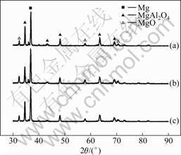 Fig.2 XRD patterns of MAO coatings formed on magnesium alloys at different current densities: (a) 3 A/dm2; (b) 4 A/dm2; (c) 5 A/dm2