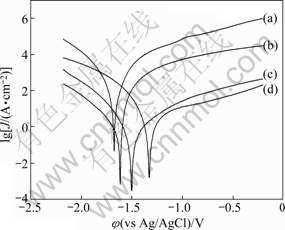 Fig.3 Polarization curves of substrate and ceramic coatings formed at different current densities: (a) Substrate, magnesium alloy; (b) Coating, 3 A/dm2; (c) Coating, 4 A/dm2; (d) Coating, 5 A/dm2